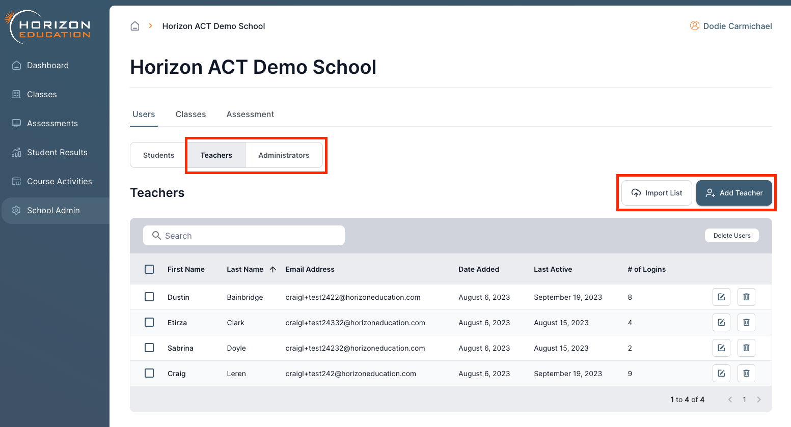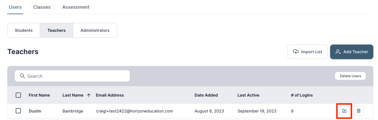 To view a list of all teachers and administrators with accounts at the school, Admins have a School Admin tab on left navigation bar. From the Users tab, click on either Teachers or Administrators.