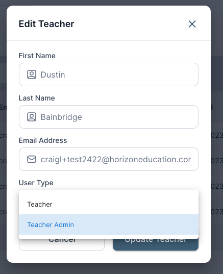 School Admins are able to edit the user type for all Teachers and Admins at the school. First click the Edit button next to the user you are wishing to update. A pop up will open and you are able to change the user type from Teacher to Teacher Admin.