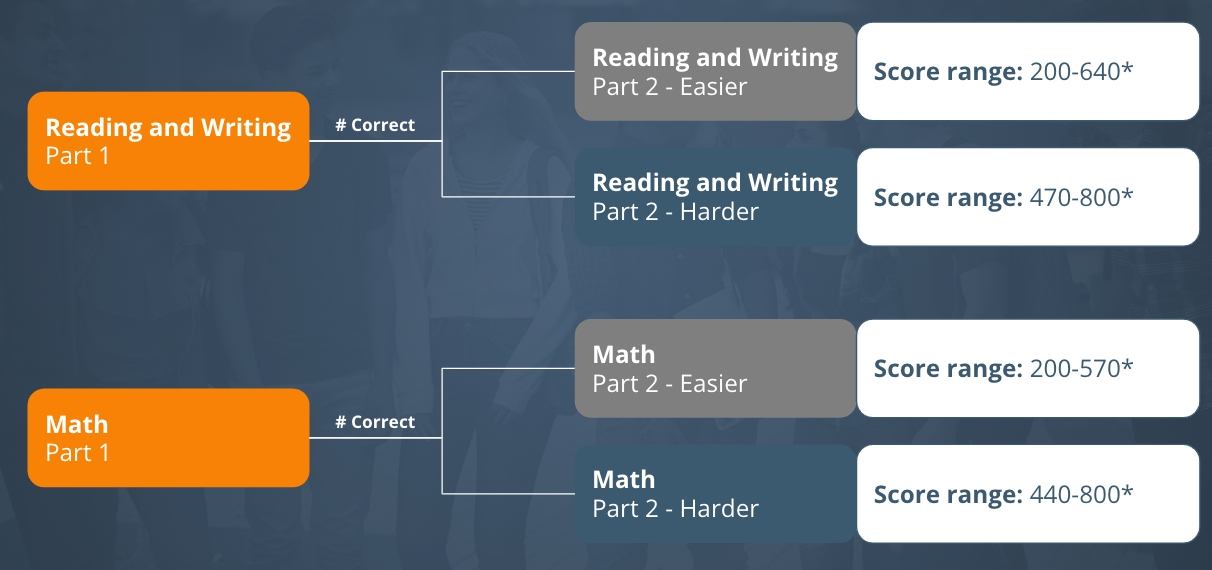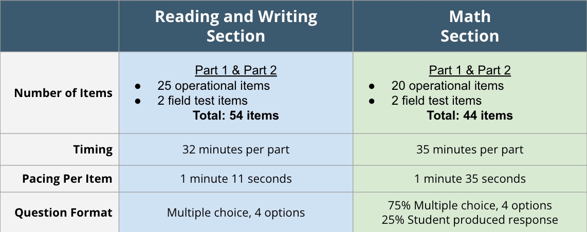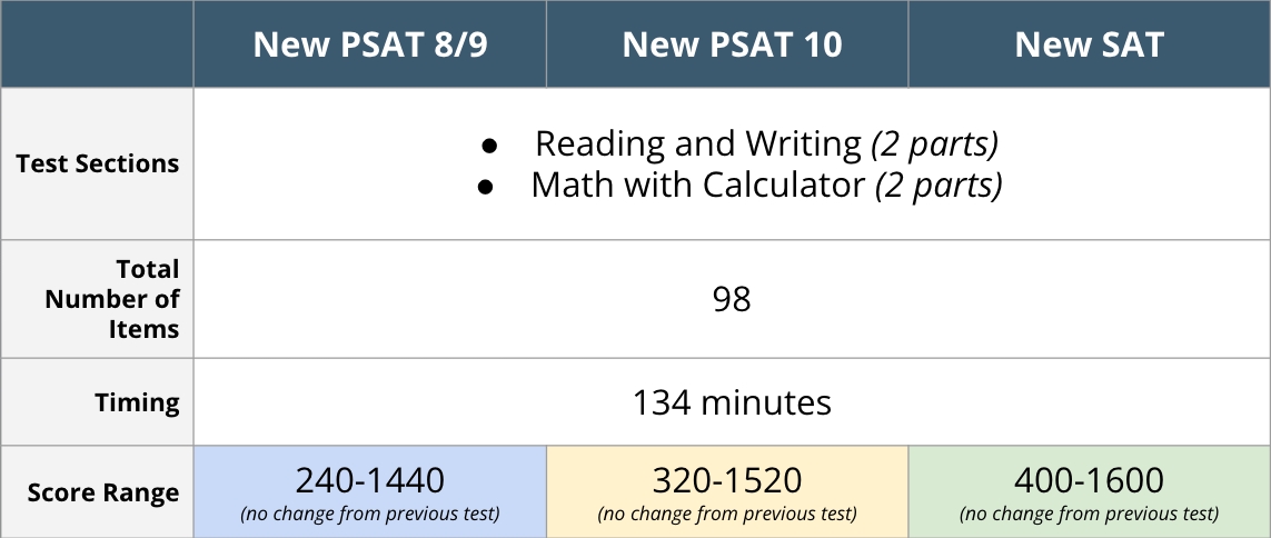 On the new digital adaptive versions of the SAT/PSAT suite of assessments, all 3 tests (PSAT 8/9, PSAT 10, SAT) have the exact same number of questions and time allowed per section. The only difference between the tests is the level of difficulty and score ranges, which have not changed from the previous version of the assessments.