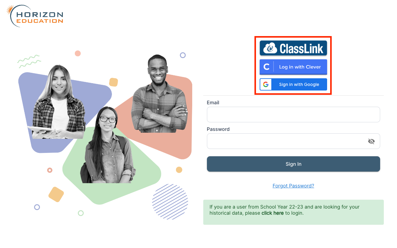 Horizon Education recommends that students log in via a Single Sign In option whenever possible to avoid the hassle of creating and keeping track of a password. We offer the following options available directly on our [Log In Page](https://portal.horizoneducation.com/).