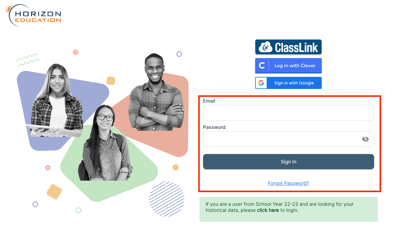 Regardless of how students were rostered (Spreadsheet Upload, Clever/ClassLink roster sync) students have the ability to log in with a email address and password. If a student hasn't created a password for their account, they should click the [Forgot Password](https://portal.horizoneducation.com/forgot-password) link, enter their email address, and then follow the link to create a password.