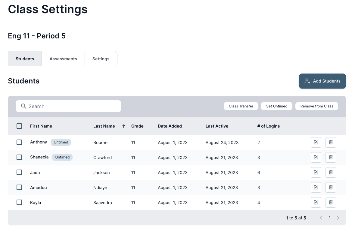 The Students tab shows all of the students enrolled in that particular class. From this tab, teachers/admins are able to: