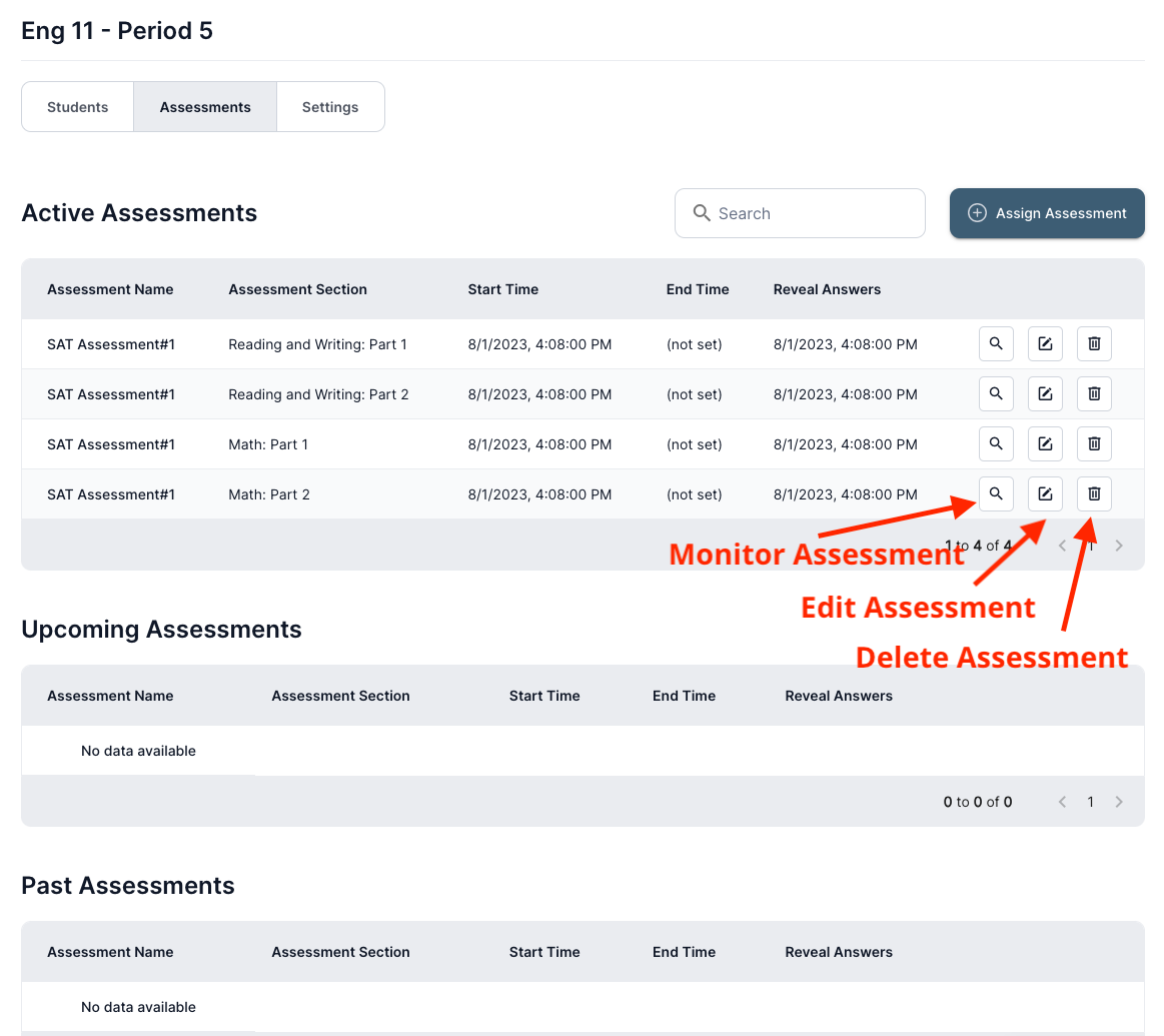 The Assessments tab shows all of the Active, Upcoming, and Past Assessment Assignments for that specific class. It also gives quick access to assign a new assessment, edit an existing assessment assignment, delete an an assessment assignment, and monitor an active assessment assignment.