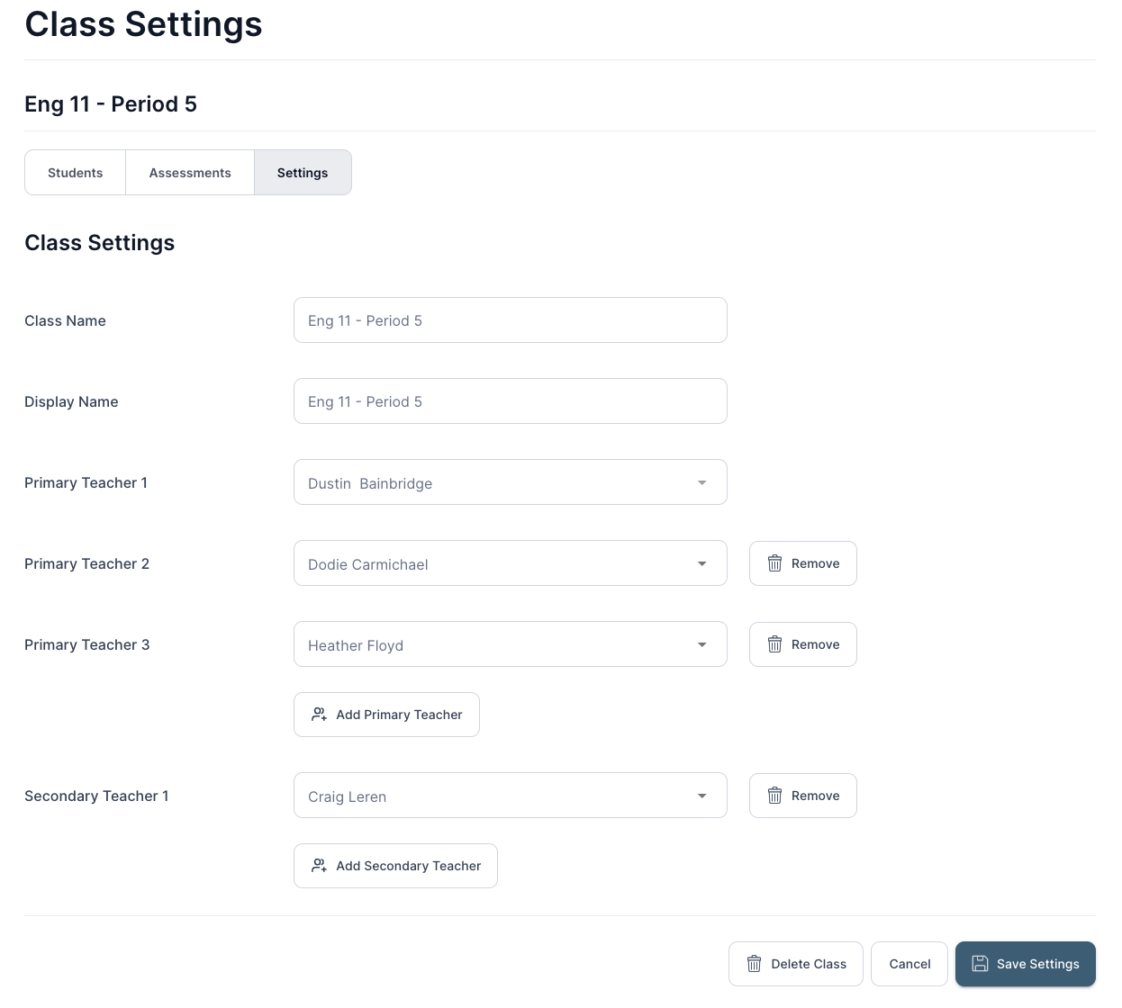 Add/Remove Primary Teacher Primary Teachers have the full suite of class functionality which includes editing rosters, assigning/editing assessments, resetting assessment sections for students, and viewing student results