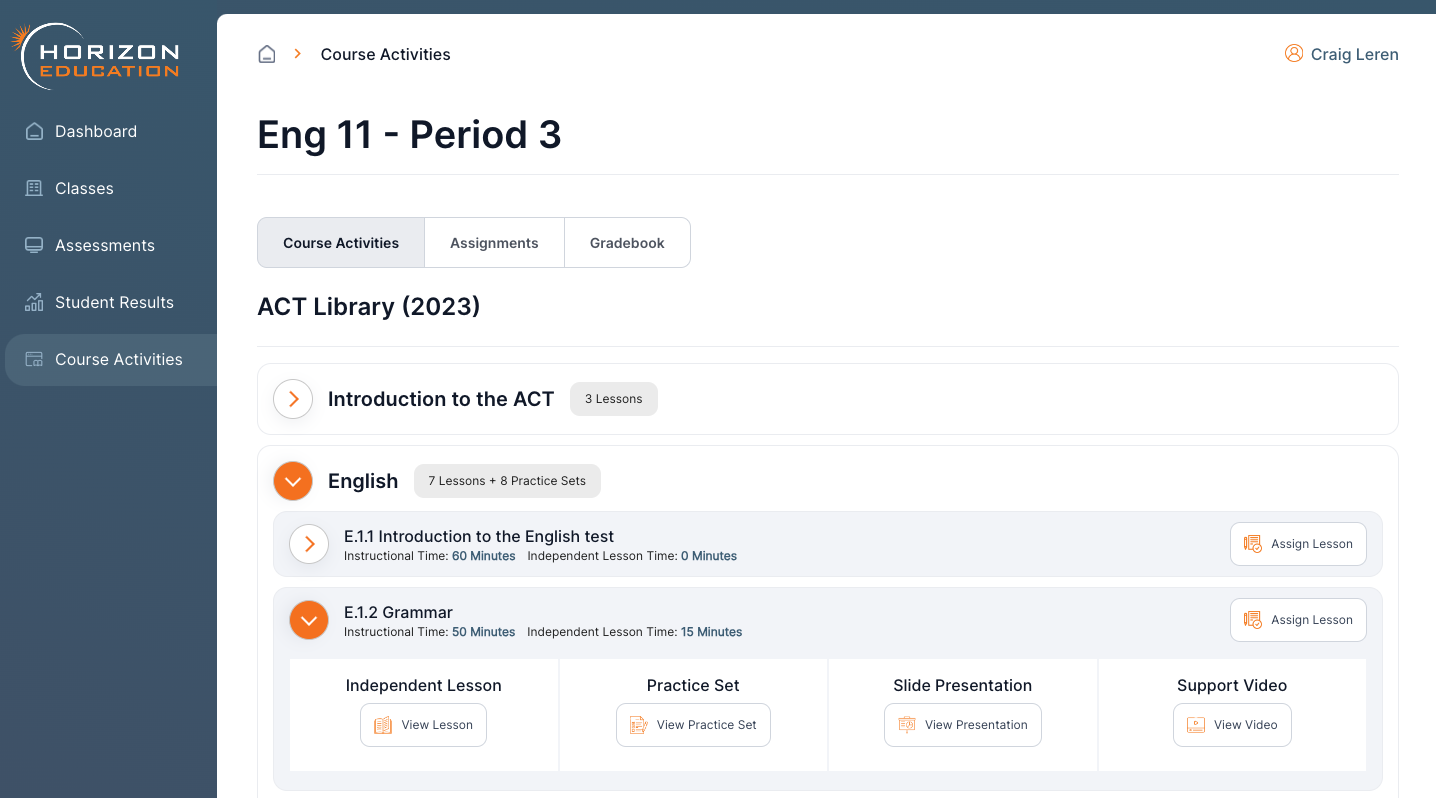 After clicking the Course Activities button, Teachers/Admins will be directed to a landing page that houses all of the Horizon created lessons and activities. Every course section houses corresponding lessons. Students will only be able to view lessons that have been assigned by their coursework teacher. Each lesson provides an overview of estimated Instructional Time and Independent Lesson Time, assisting teachers in the coursework planning process. β Independent Lessons include instructional text and activities for students to gain a deep understanding of the topic area. Once students complete assigned activities, Teachers/Admins are able to view an Item Analysis report.