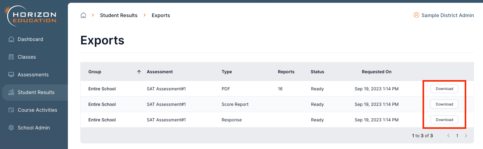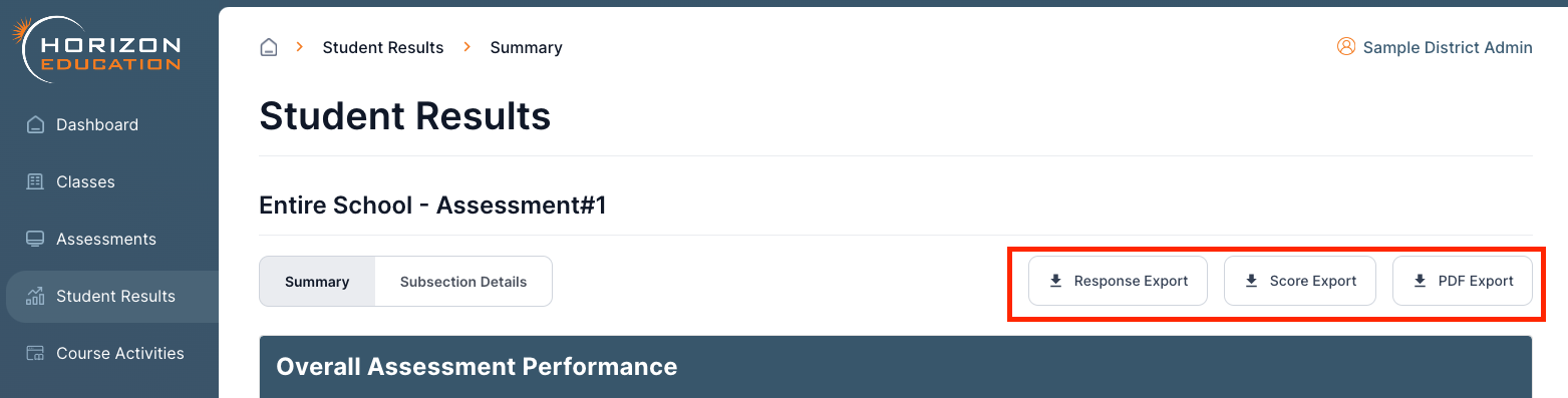 For each student assessment report, three different types of exports can be downloaded by teachers and administrators.