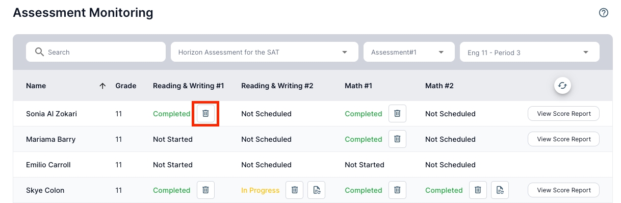 To reset an assessment section, click the trash can icon next to any section that has the Completed or In Progress status. Resetting a section will permanently delete all student response data for this section and make it available for them to retake. Deleted data cannot be recovered.
