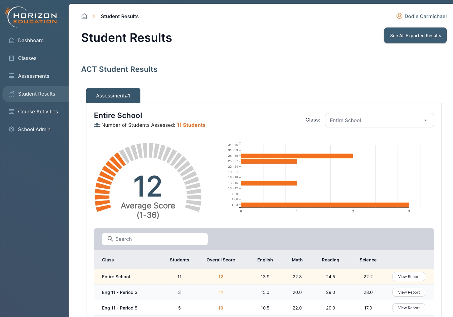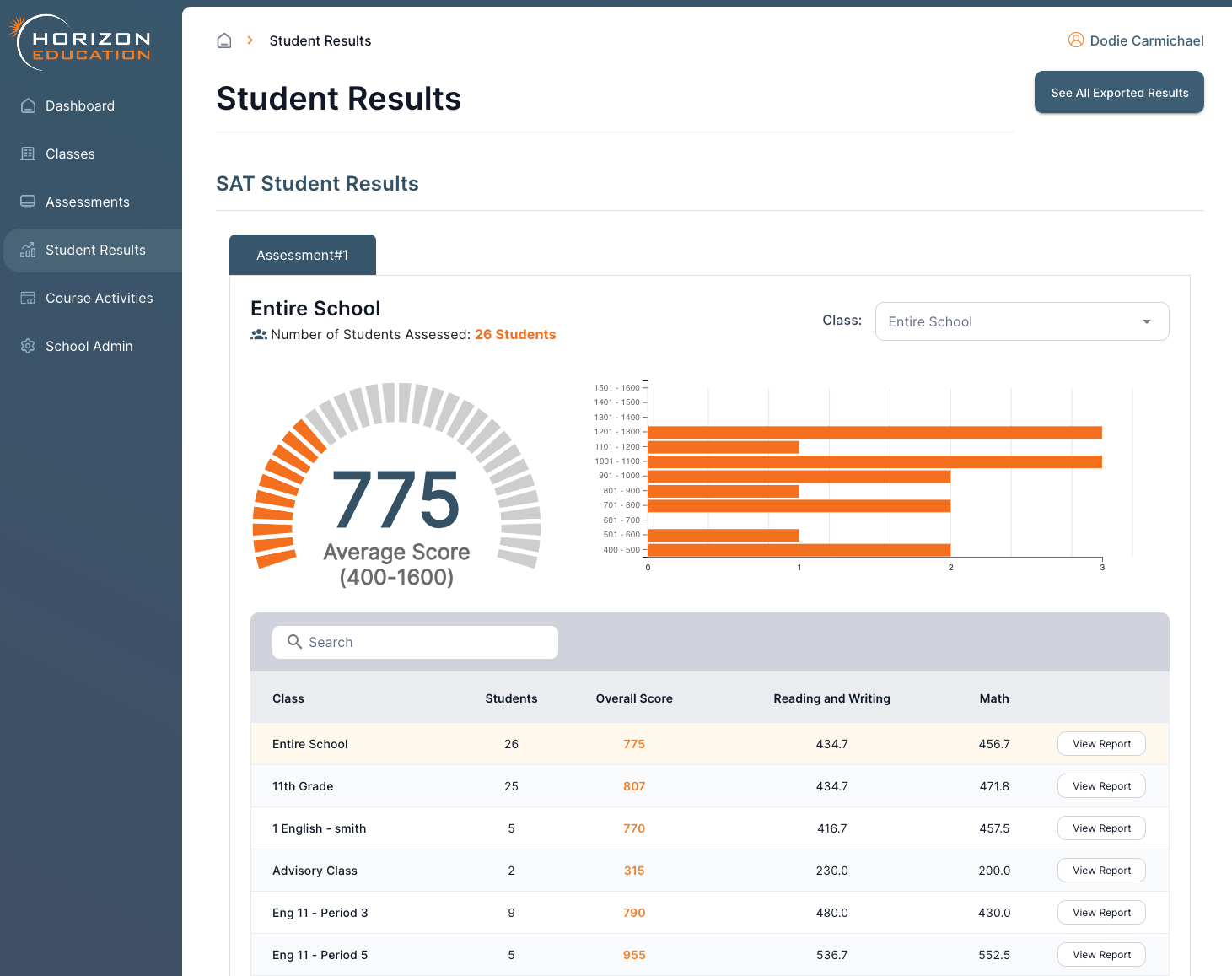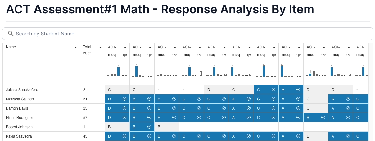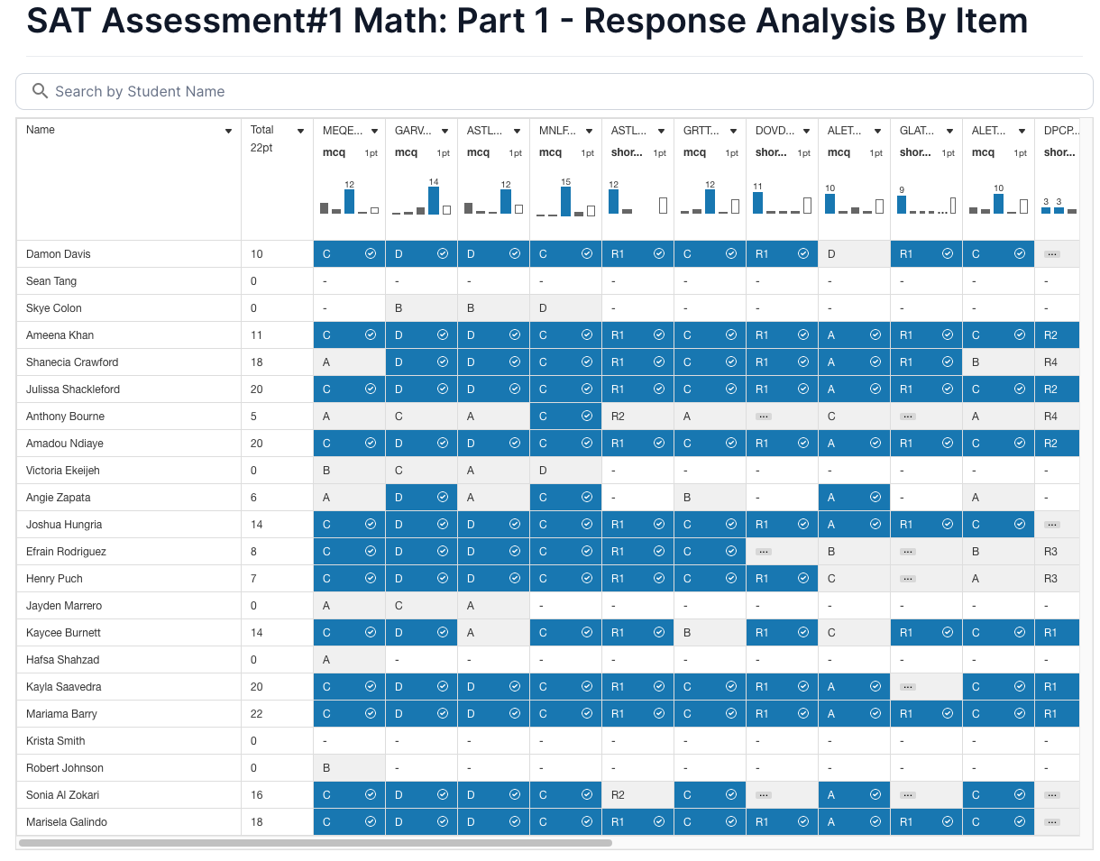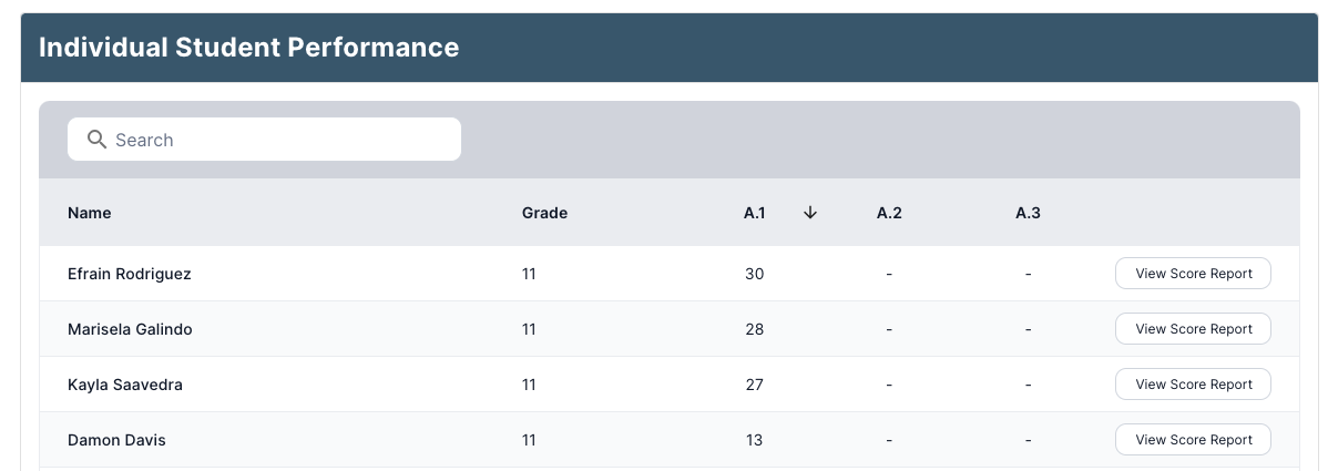 After students complete practice assessments, Teachers/Admins are able to view scoring data immediately from the Student Results page.