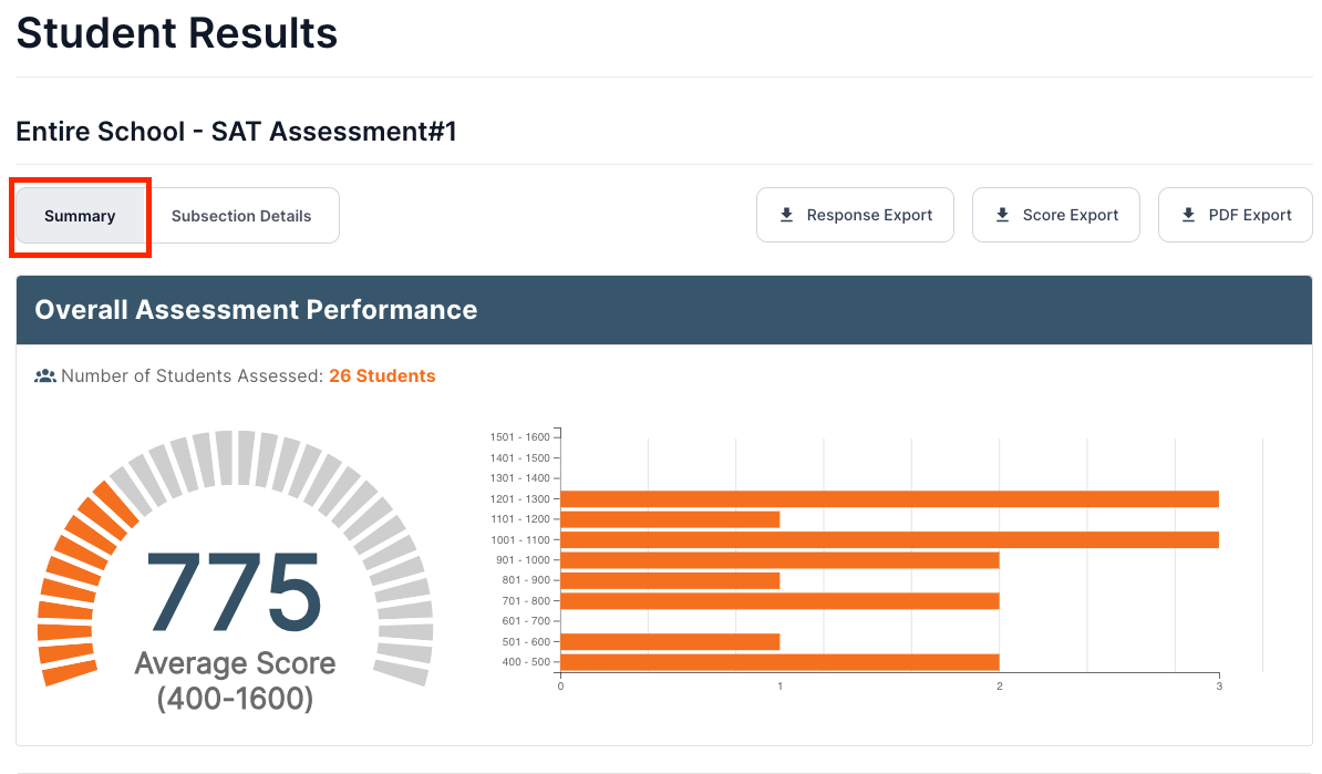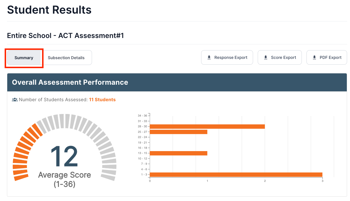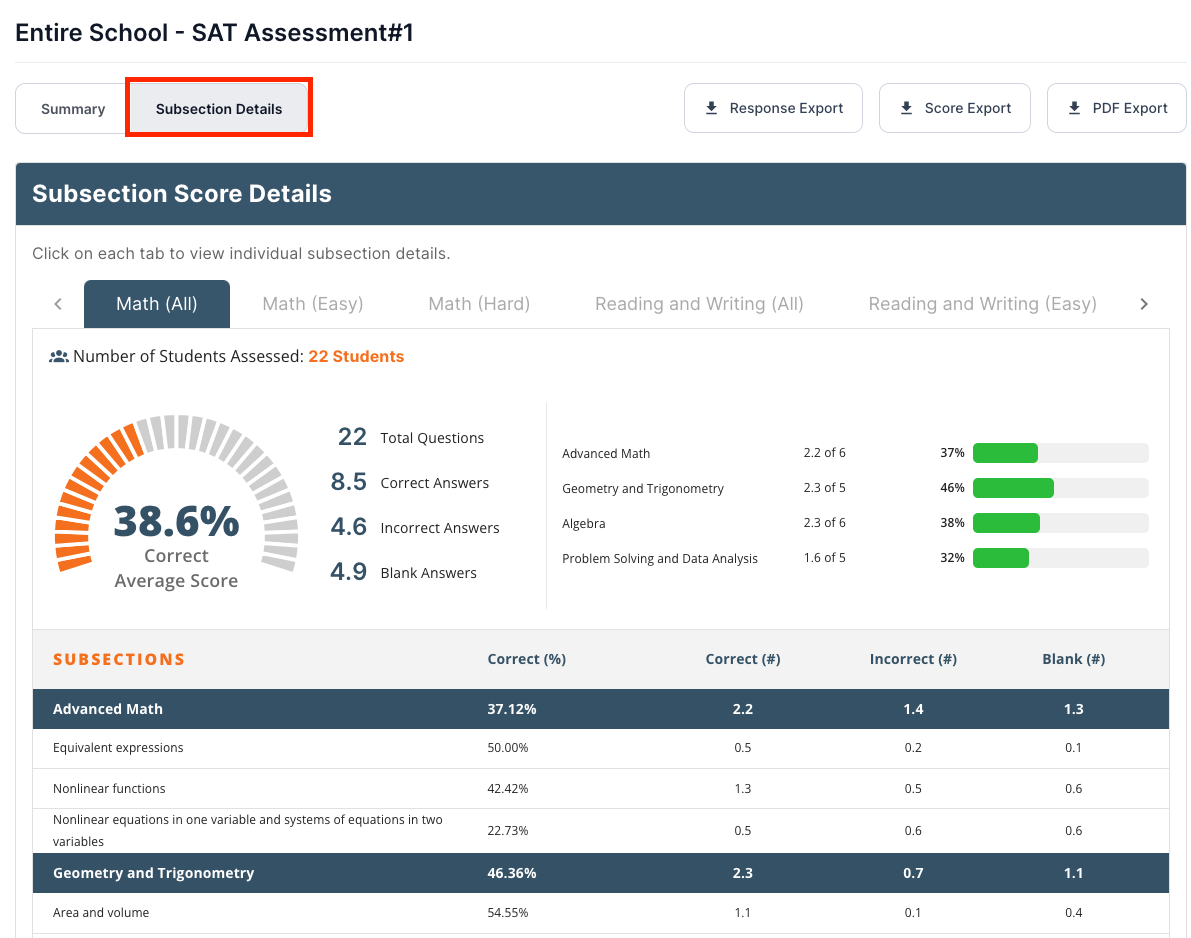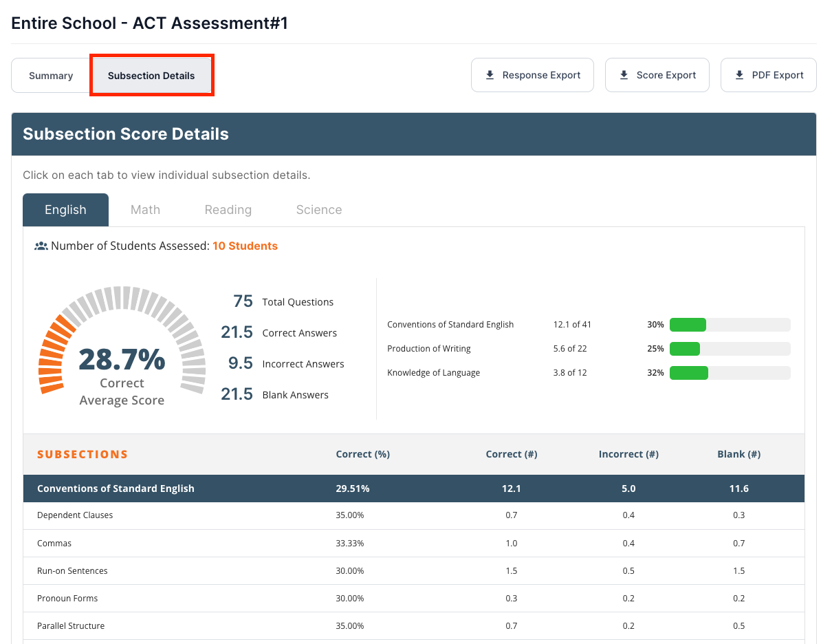 The Subsection Details section provides Teachers/Admins with an extensive breakdown on how students performed on each section of the assessment