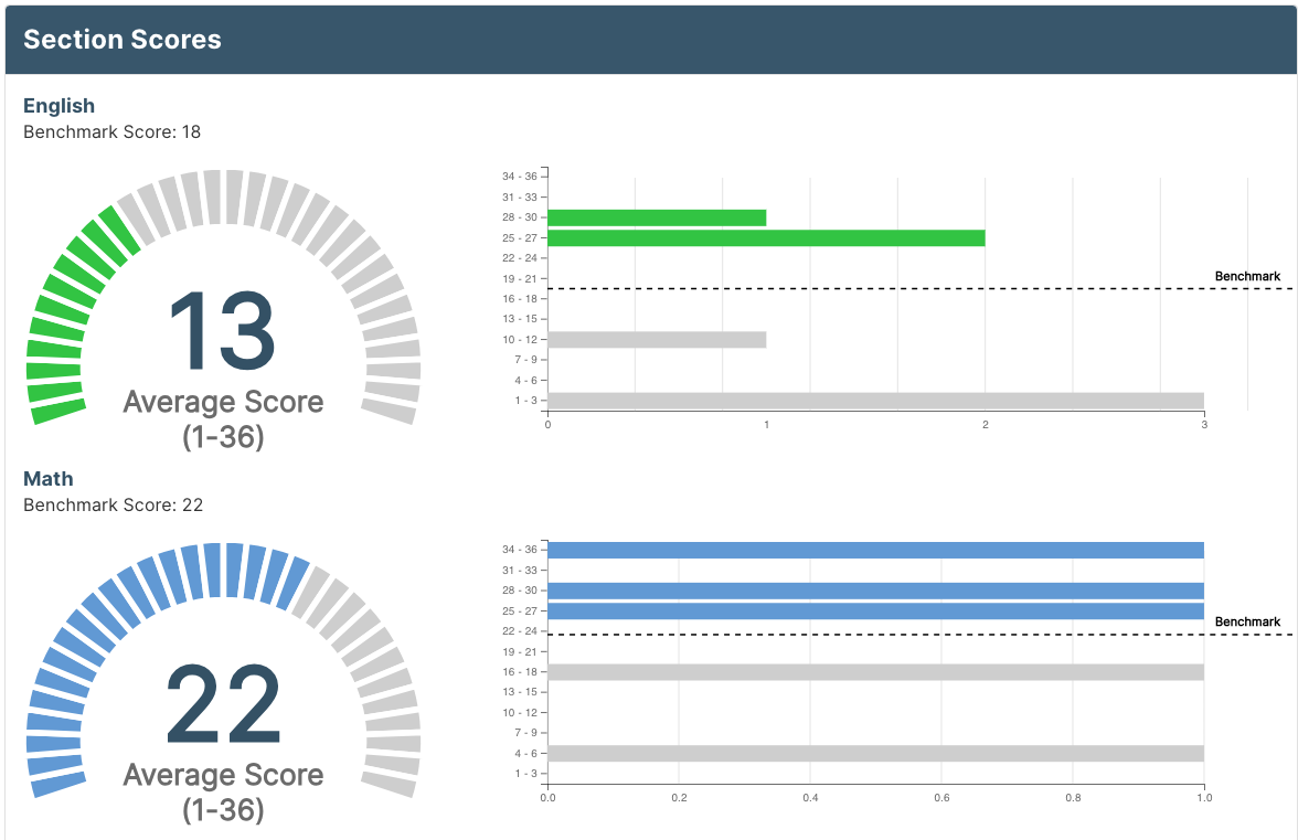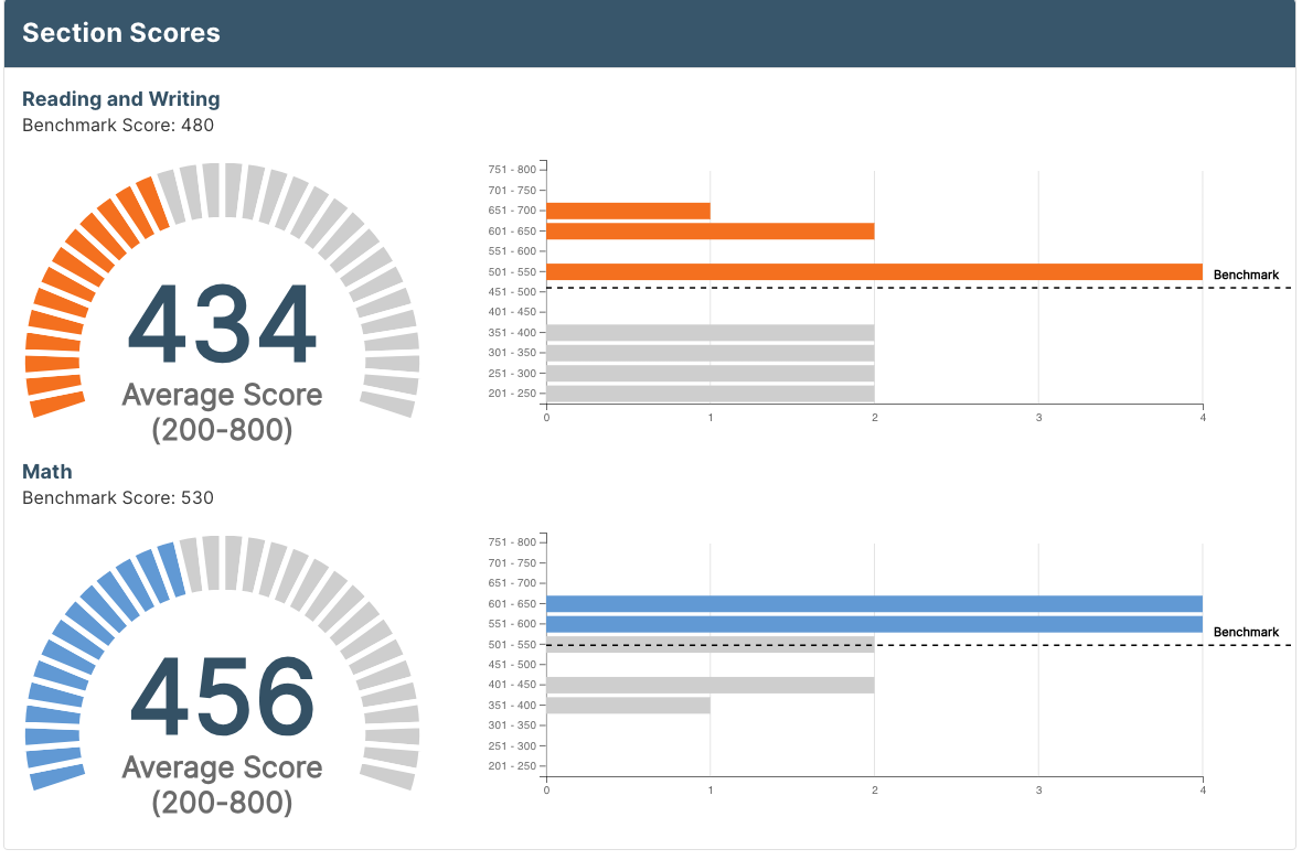 Next, a Section Score group breakdown is provided, showing average score, benchmark score, and a histogram of student performance.
