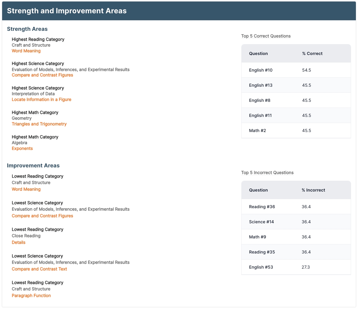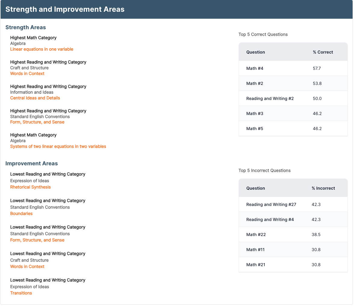 The Strength & Improvement Areas section reveals the top strength and improvement areas by assessment section, subsection, and topic area. Also provided are the Top 5 Correct and Incorrect Questions.