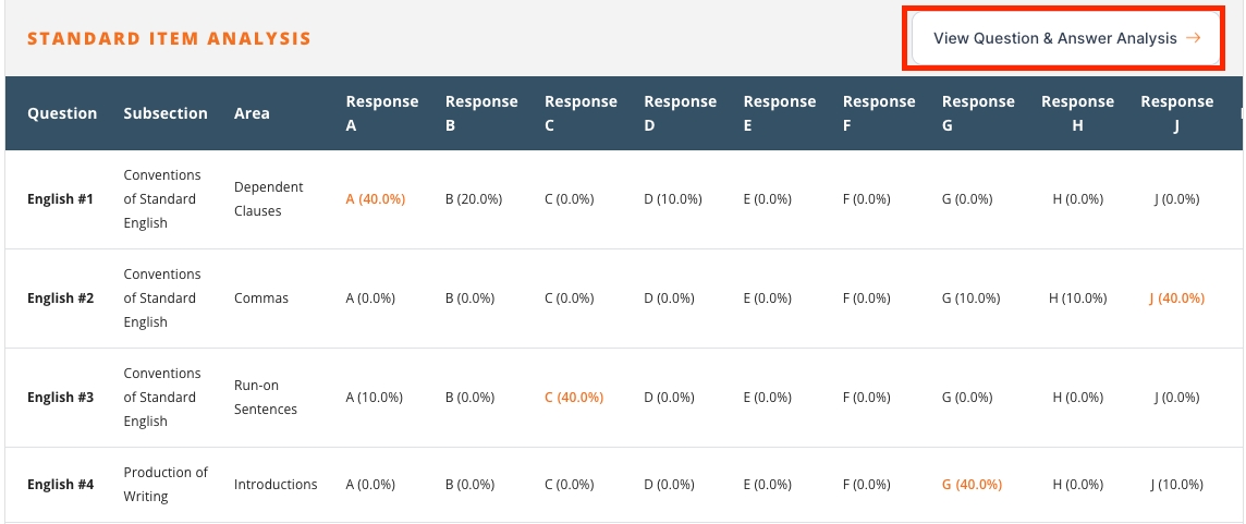 The View Question & Answer Analysis button opens a new tab with a report that details how each student performed on every item of the assessment.